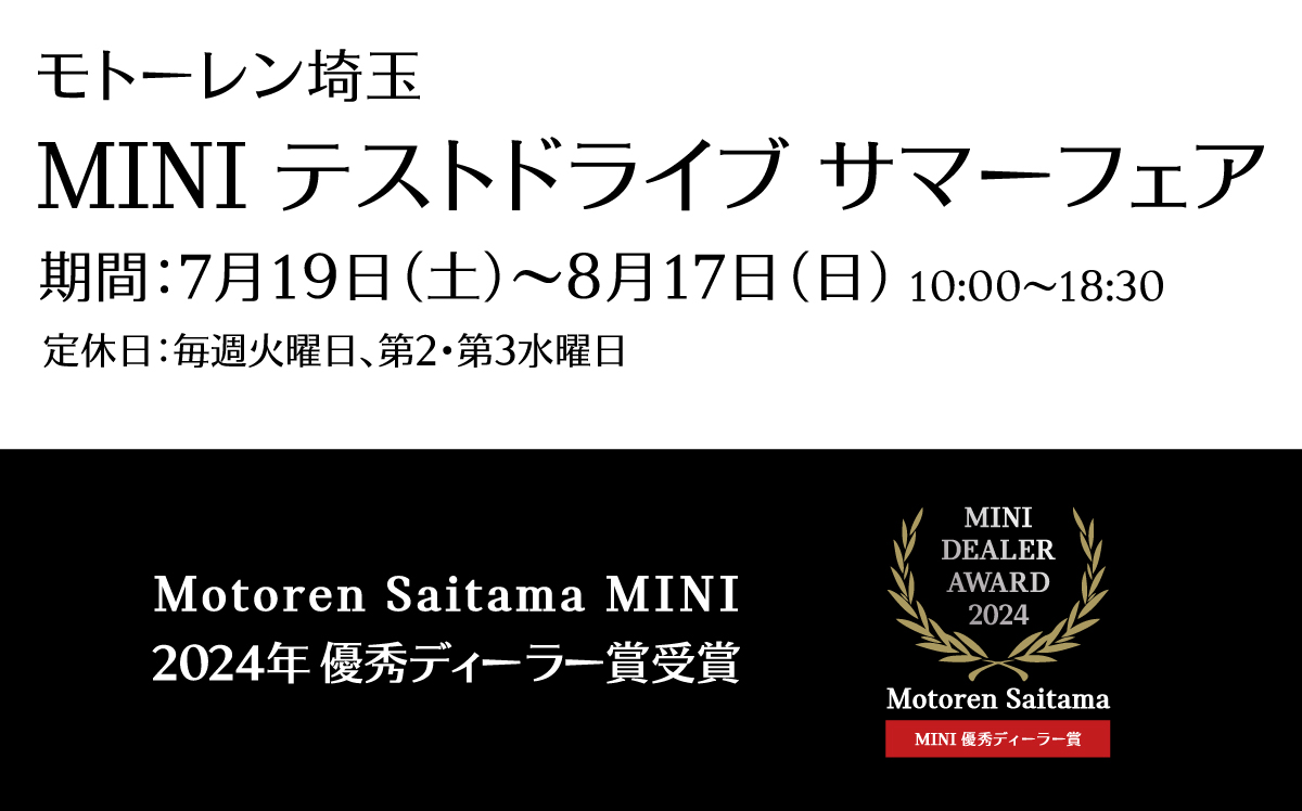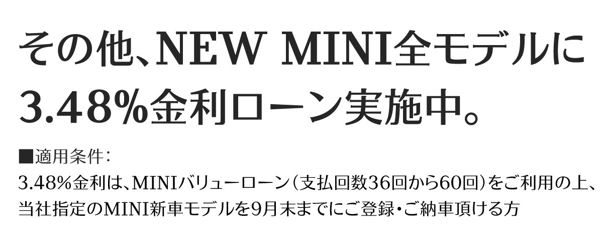※金利は実質年率。通常金利の実質年率は4.75%です。以上の内容は、予告なく変更・終了する場合がございます。上記手数料率は、指定の新車モデルの購入にMINIオートローンまたはMINIオートリース(支払い回数36回から60回払いまで)をご利用いただいた場合に適用されます(MINIスタンダードローンを除く)。※車両生産・部品供給等の状況により販売モデルおよび商品仕様が変更される場合があります。詳細につきましてはお近くのMINI正規ディーラーまでお問い合わせください。※表示価格には、付属品価格、保険料、税金(消費税を除く)、登録に伴う諸費用、リサイクル料金は含まれておりません。別途必要となります。※掲載の画像は欧州仕様車であり、日本仕様のモデルとは細部で異なる場合があります。また、一部イメージ画像も含まれます。本仕様・諸元・価格等、記載の内容は2025年7月現在のものであり、予告なく変更される場合があります。実際の色と異なる場合があります。記載事項および写真の版権は、BMW AG(ドイツ)およびビー・エム・ダブリュー株式会社に帰属します。無断転載を禁じます。詳細につきましてはお近くのMINI正規ディーラーにお問い合わせください。